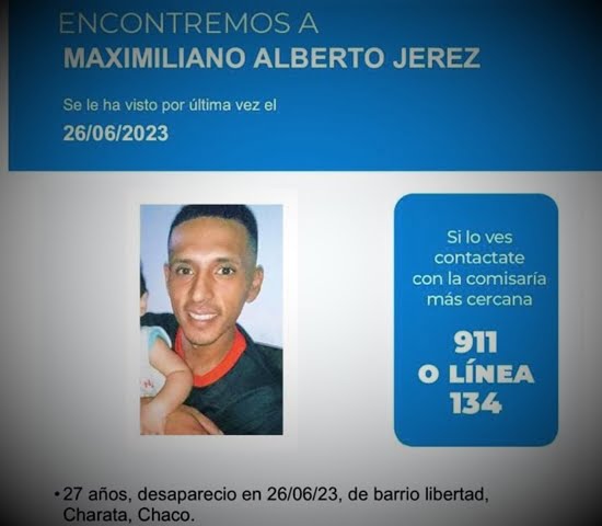 Maximiliano Alberto Jerez es un joven charatense de 27 años, quien fue visto por última vez el pasado 26 de Junio del corriente año, quien tiene domicilio en el Barrio Libertad de la localidad de Charata.