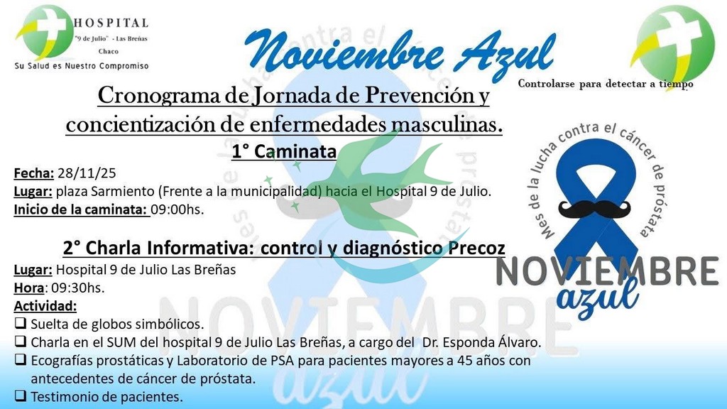 La actividad enmarcada dentro del “Mes de Noviembre Azul”, está destinada especialmente para todos los hombres mayores de 45 años o que tengan antecedentes de Cáncer de Próstata, se realizarán estudios de PSA a los mismos en manera preventiva, teniendo en cuenta que esta enfermedad no tendría síntomas, siendo este estudio una manera especial para poder detectar la misma.
