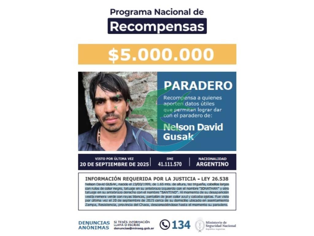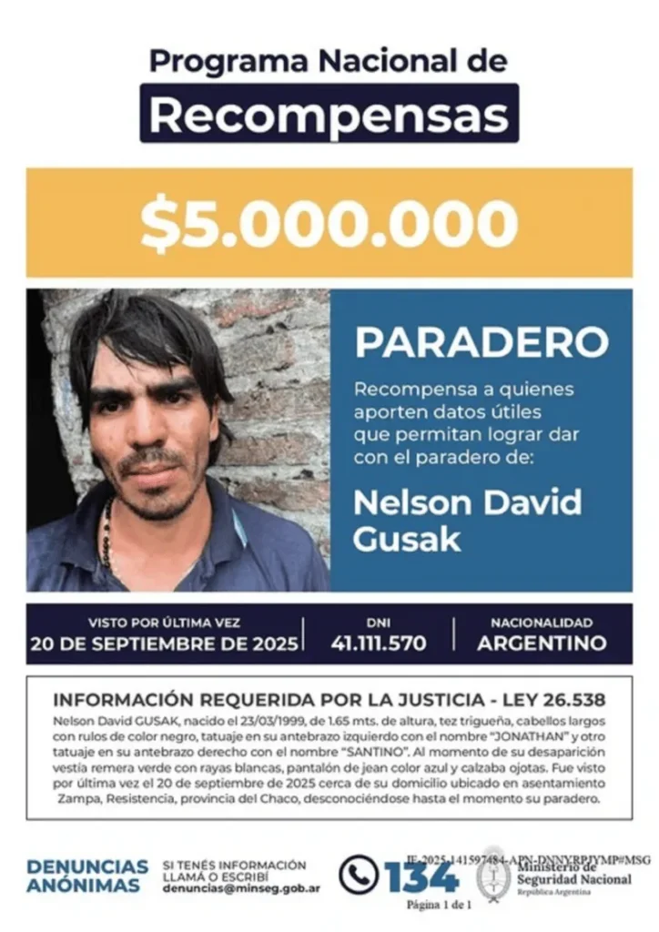 Desde el Programa Nacional de Recompensa se emitió un pasquín en donde se muestra la imagen de Nelson Davis Gusak, (27 años) nacido el 23/03/1999, de 1.65 mts. de altura, tez trigueña, cabellos largos con rulos de color negro, tatuaje en su antebrazo izquierdo con el nombre “JONATHAN” y otro tatuaje en su antebrazo derecho con el nombre “SANTINO”. Al momento de su desaparición vestía remera verde con rayas blancas, pantalón de jean color azul y calzaba ojotas. Fue visto por última vez el 20 de septiembre de 2025 cerca de su domicilio ubicado en asentamiento Zampa, Resistencia, provincia del Chaco, desconociéndose hasta el momento su paradero.
