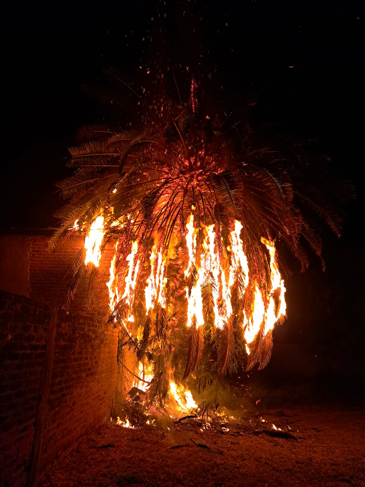 Al arribar, el personal constató que la palmera se encontraba en plena combustión y que el fuego podía extenderse hacia estructuras cercanas, especialmente un galpón ubicado a pocos metros, lo que incrementaba el riesgo de daños materiales de consideración.