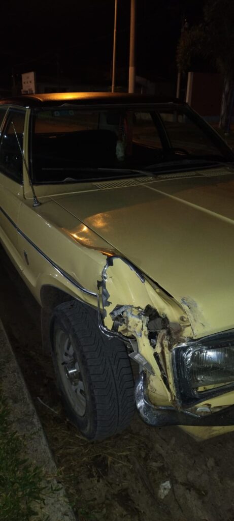 Al salir, constató que su rodado había sido colisionado en la parte trasera lateral izquierda por un automóvil marca Ford Taunus, color amarillo, dominio SMJ-360, cuyo conductor se dio a la fuga inmediatamente.