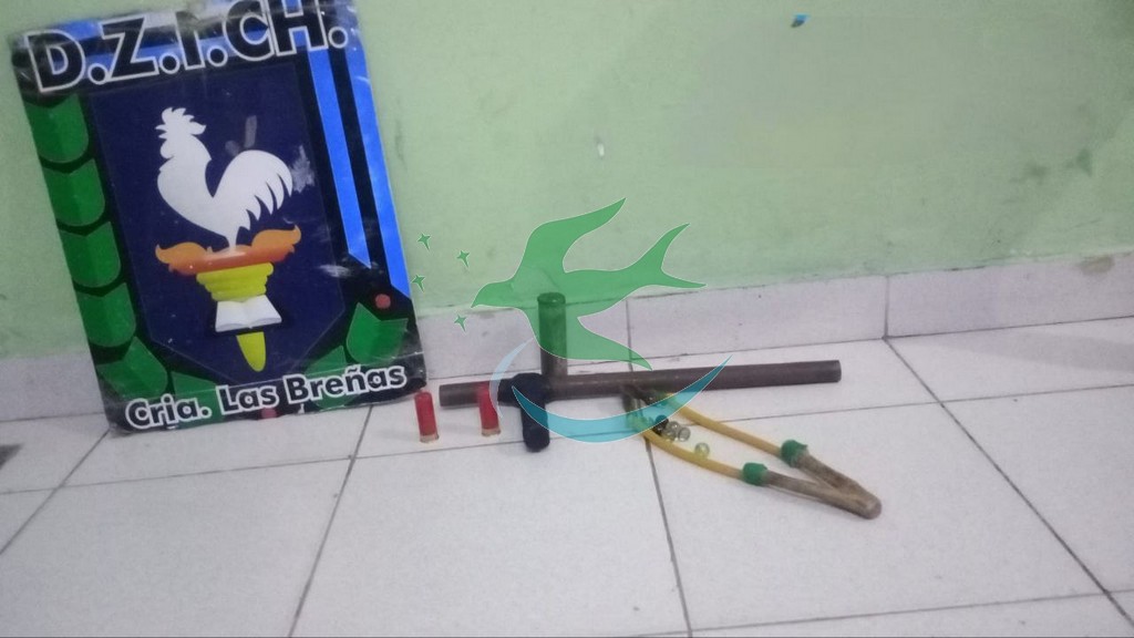 Cuando fueron reducidos, se les secuestró en poder de los mismos un arma de fabricación casera denominada “tumbera” con 2 cartuchos calibre 12mm color rojo sin percutar y una gomera con 6 bolitas de vidrio.