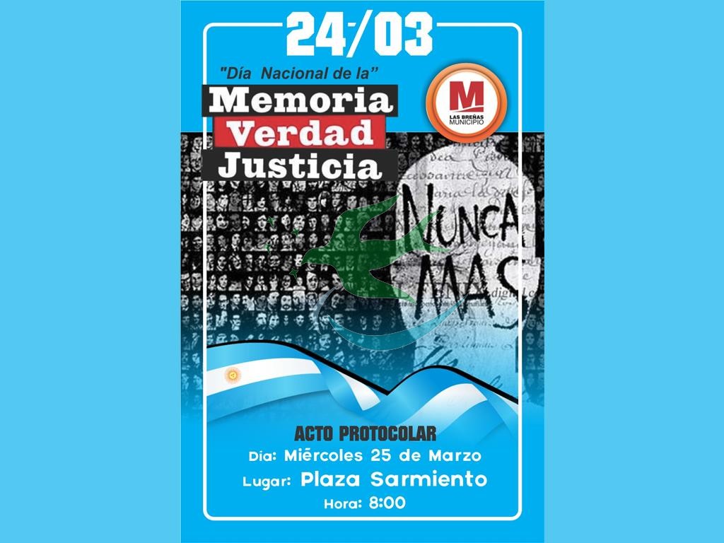 “En el marco del Día Nacional de la Memoria por la Verdad y la Justicia, la Municipalidad de Las Breñas invita a la comunidad a participar del acto conmemorativo que se realizará el día Miércoles 25 de Marzo a las 8:00 horas en el mástil de Plaza Sarmiento.